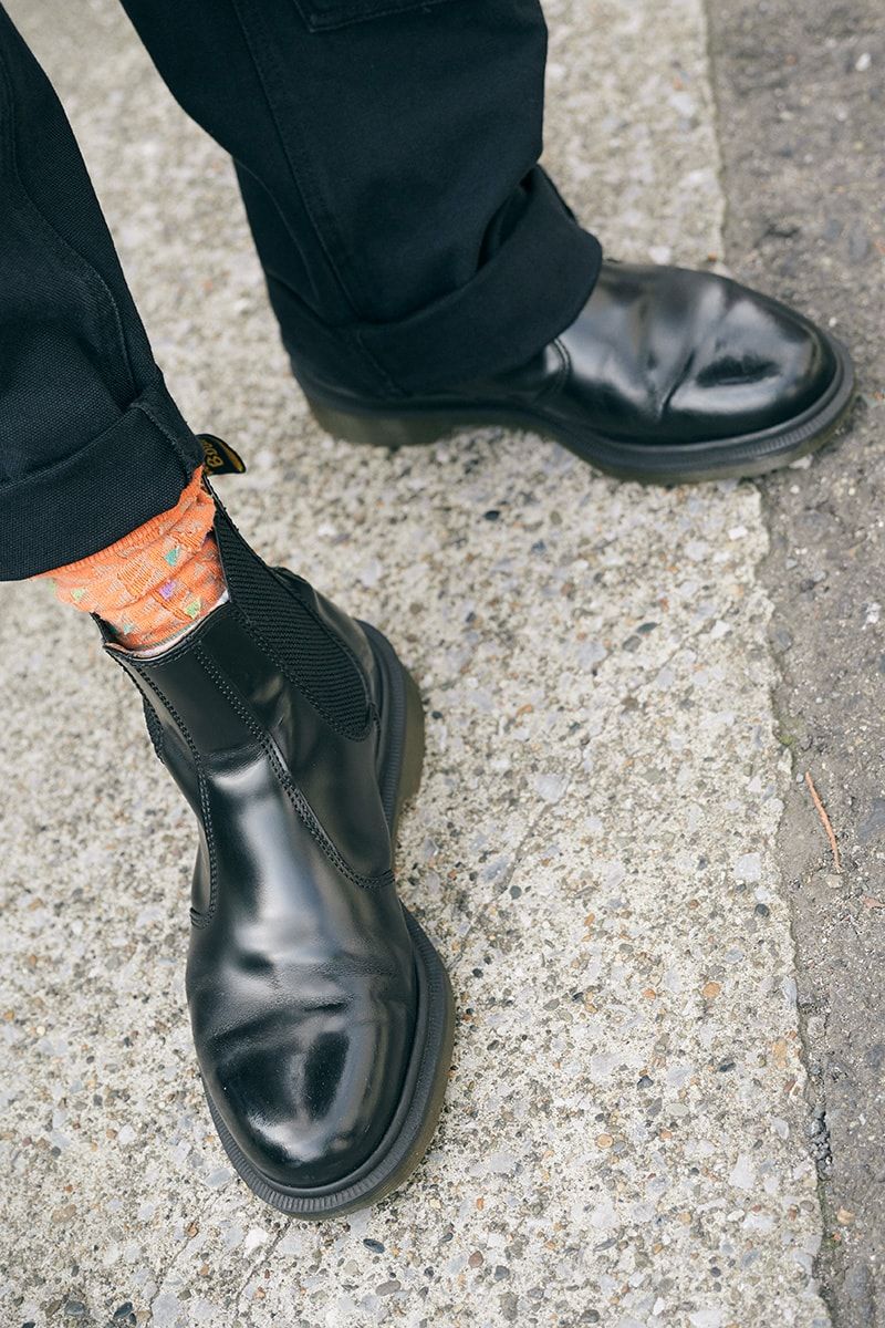 シャツ=古着 ブーツ=ドクターマーチン キャップ=ニューエラ サングラス=レイバン 腕時計=シチズン