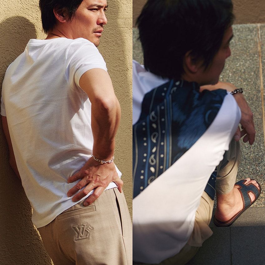 サンダル14万1900円、パンツ18万1500円、スカーフ8万1400円、ブレスレット40万9200円/すべてエルメス(エルメスジャポン 03-3569-3300)