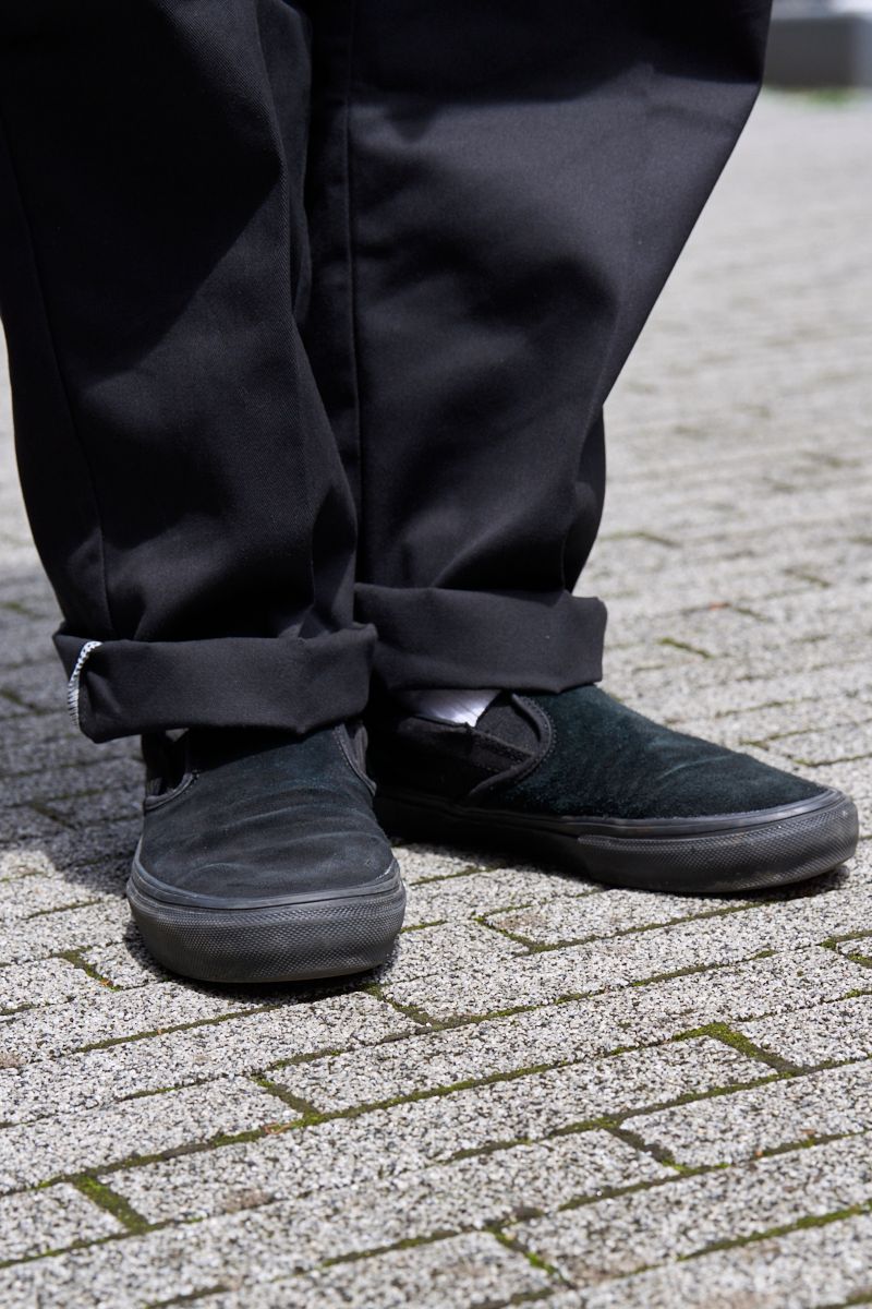サイズ感はやや大きめ。裾をワンクッション程度にロールアップさせ、相性間違いなしのヴァンズを合わせた。そして、トップスは、スモーキーな色味が絶妙なスケーターブランドのシャツを羽織り、王道のストリートスタイルに。
