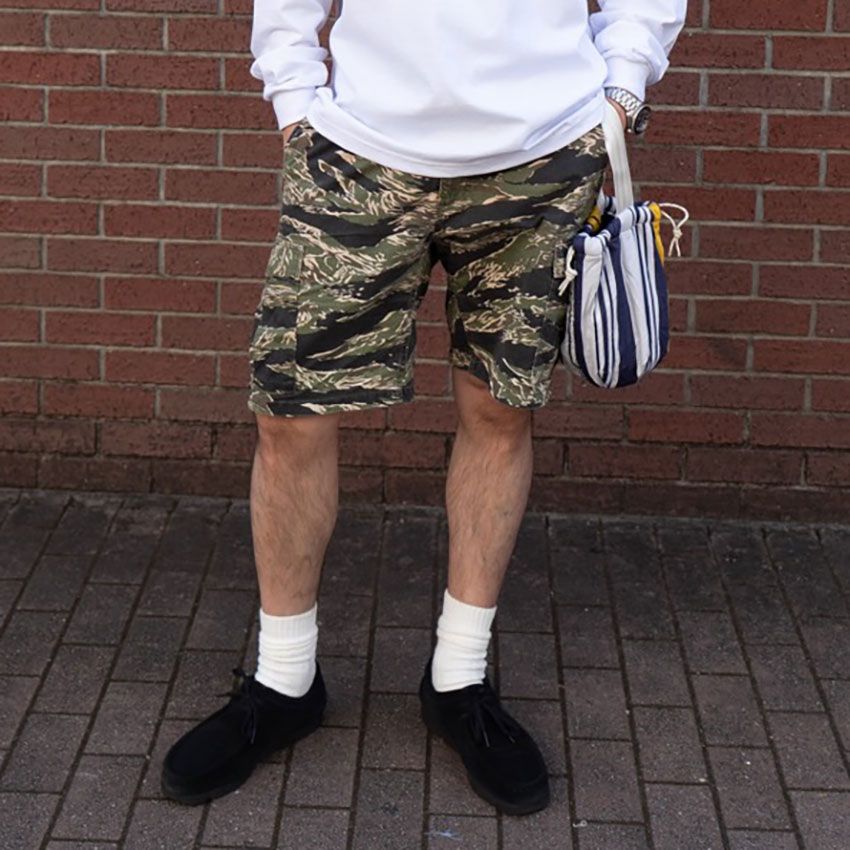 阿部さんのスナップをすべて見る阿部健太郎さん(32歳)シャカウェアのロンTとロンハーマンのカモフラ柄ショーツというシンプルカジュアルな着こなし。足元にはクラークスのシューズと白ソックスを合わせ、上品さを演出した。