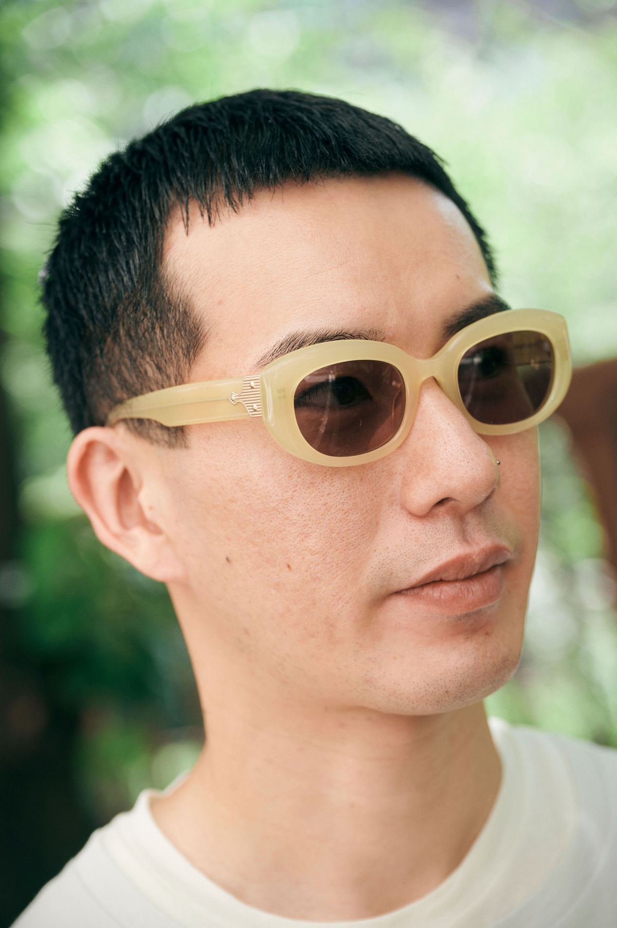 カットソー=ジルサンダー+ パンツ=ヴィンテージ サンダル=ビルケンシュトック バッグ=エル・エル・ビーン サングラス=マツダ