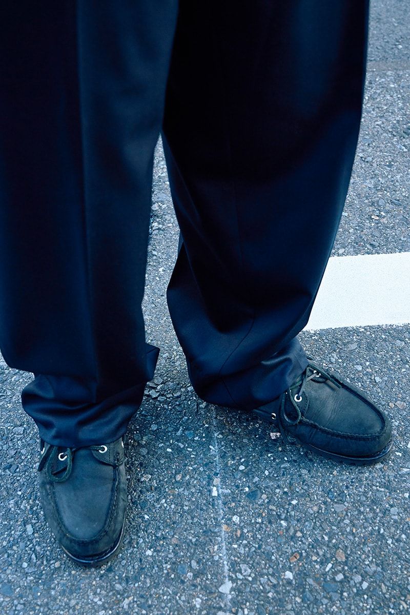 ファーストタイプのGジャンとスラックスを合わせた坂東さんは、オールネイビーの味付けに黒のスリーアイを抜擢。上品、でもちょっと野暮ったい。やはり絶妙、ちょうどいい。