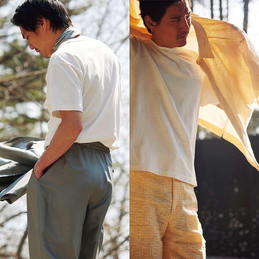 夏の風を受け涼やかになびくラグジュアリーな天然素材ウェアが、Tシャツスタイルを上質な装いへと昇華してくれる。