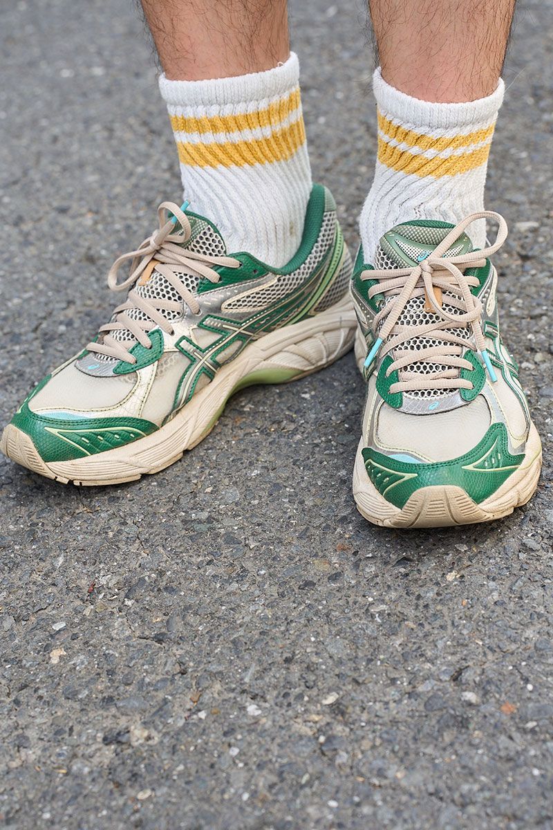 シャツ、Tシャツ、ショーツをブルー系で揃えつつ、足元はアシックスとオーストラリア発のファッションブランド「アバーヴ ザ クラウズ」のコラボ作にイエローのラインソックスで固めた。スニーカーのグリーンでTシャツのプリントの色を拾っているのもさりげなくて素敵!