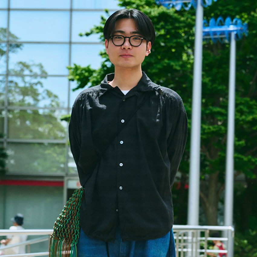 ▶︎下川さんのスナップをすべて見る下川達哉さん(25歳)彼は「エーアイイー」のシックな黒シャツに「ラングラー」のインディゴデニムで爽やかさを注入したスタイル。ジャストなトップスとルーズなボトムスのサイズバランスが絶妙だ。