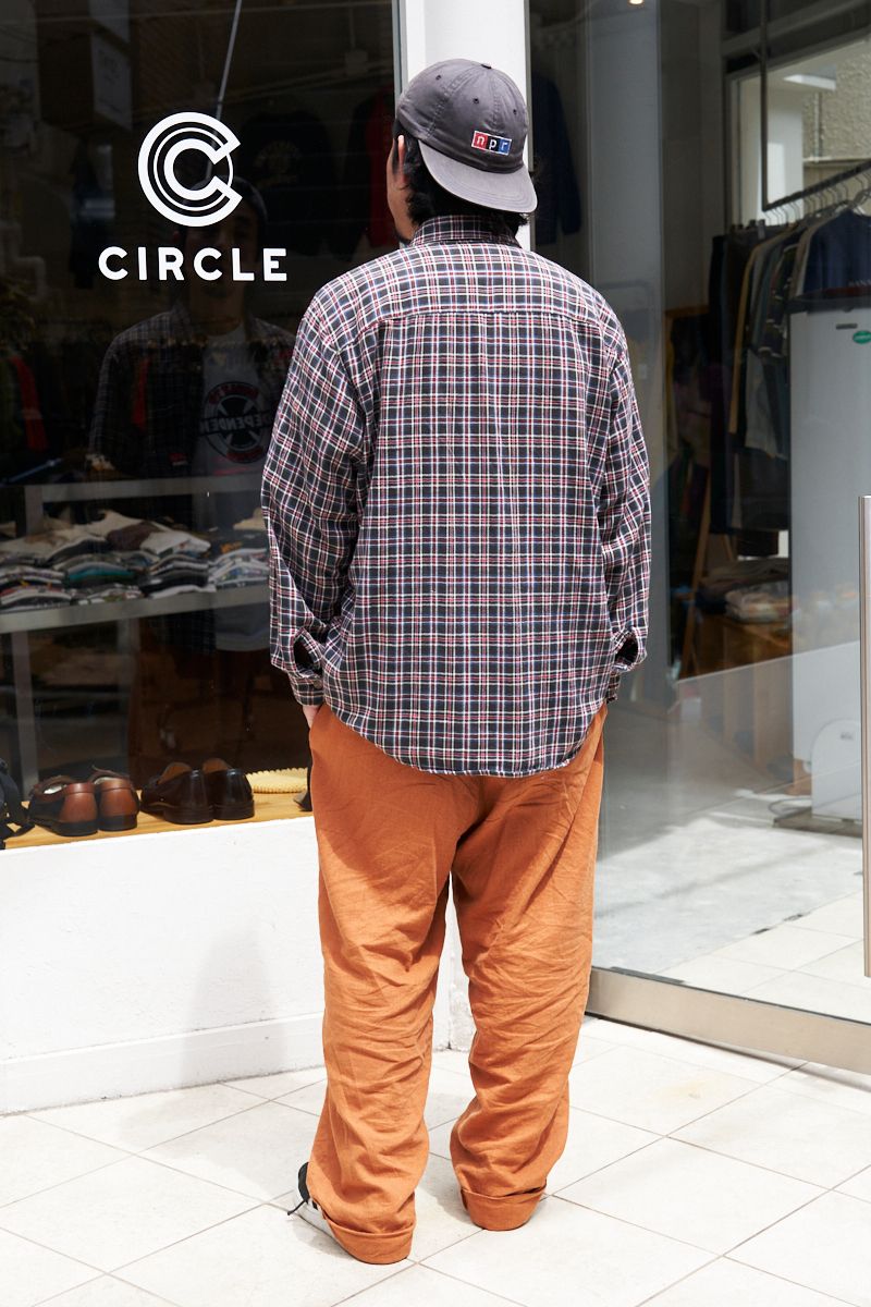 ▶︎ヤーマンさんのスナップをすべて見るヤーマンさん(36歳)柔らかな素材感のチェックシャツをジャケット感覚で羽織る。ボトムスに合わせたのは古着の太パンツ。色鮮やかなオレンジが抜群の存在感を放つ。
