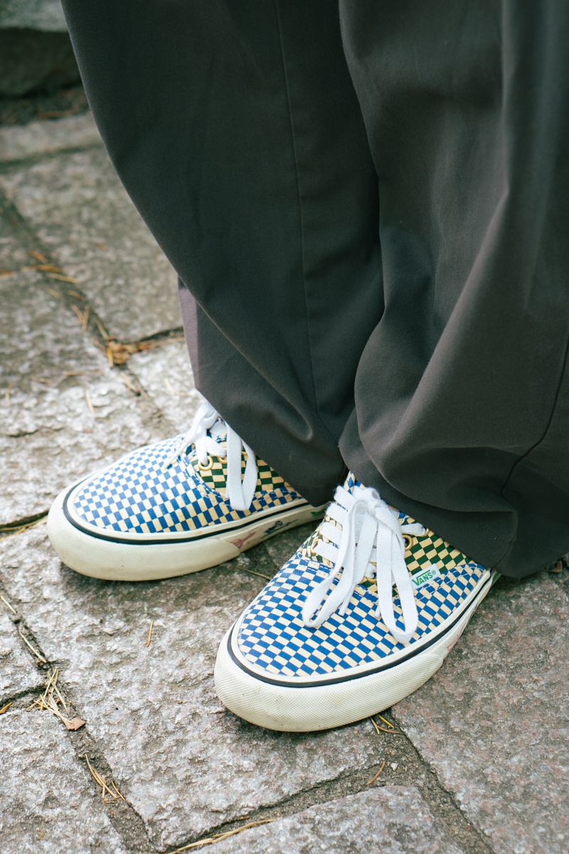 顔まわりには夏を感じる麦わら帽、足元にはアフリカのサーフカルチャーを称えるVans x Mami Wataコレクションのヴァンズを。2点にアクセントをつけて、シンプルな装いに華やかさを添えた。