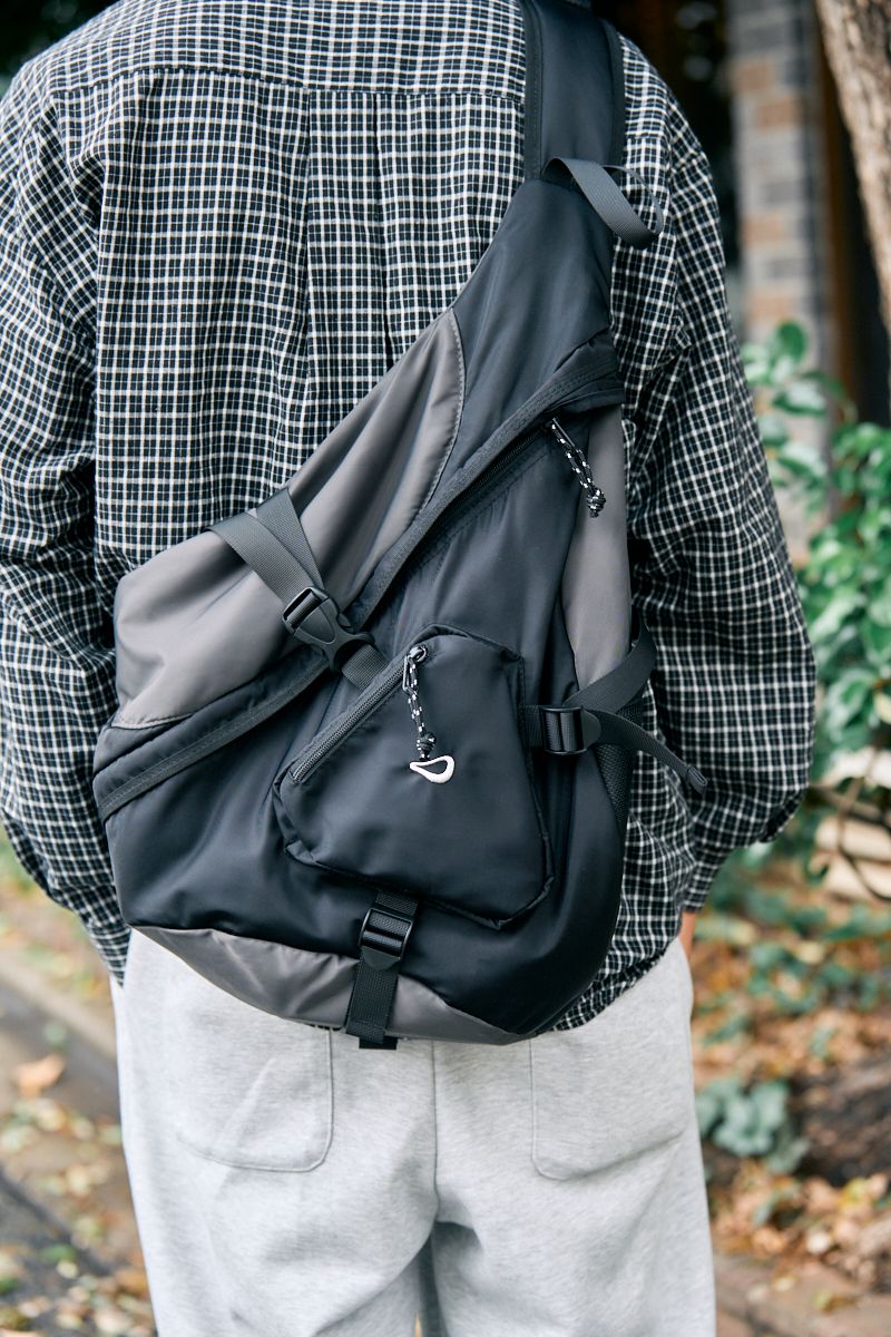 ボリューム感のあるホカのスニーカーに加え、肩がけバッグで動きをつけ、シンプルながら立体感のある着こなしに。