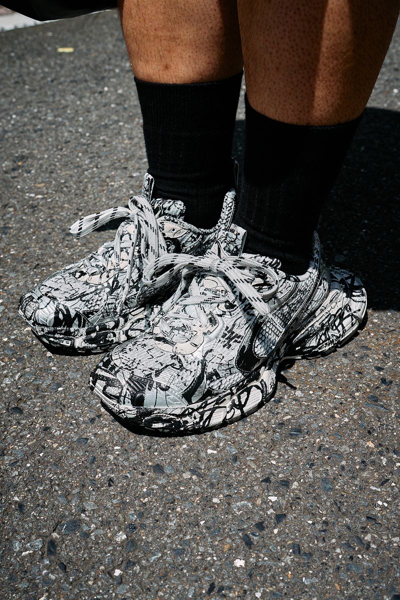 ▶︎篠崎さんのスナップをすべて見る篠崎健生さん(38歳)まずは、ハイロー織り交ぜたモノトーンスタイルから。コスパブランドのウェアとバレンシアガのモードな靴が、黒を舞台にナチュラルな融合を果たす。