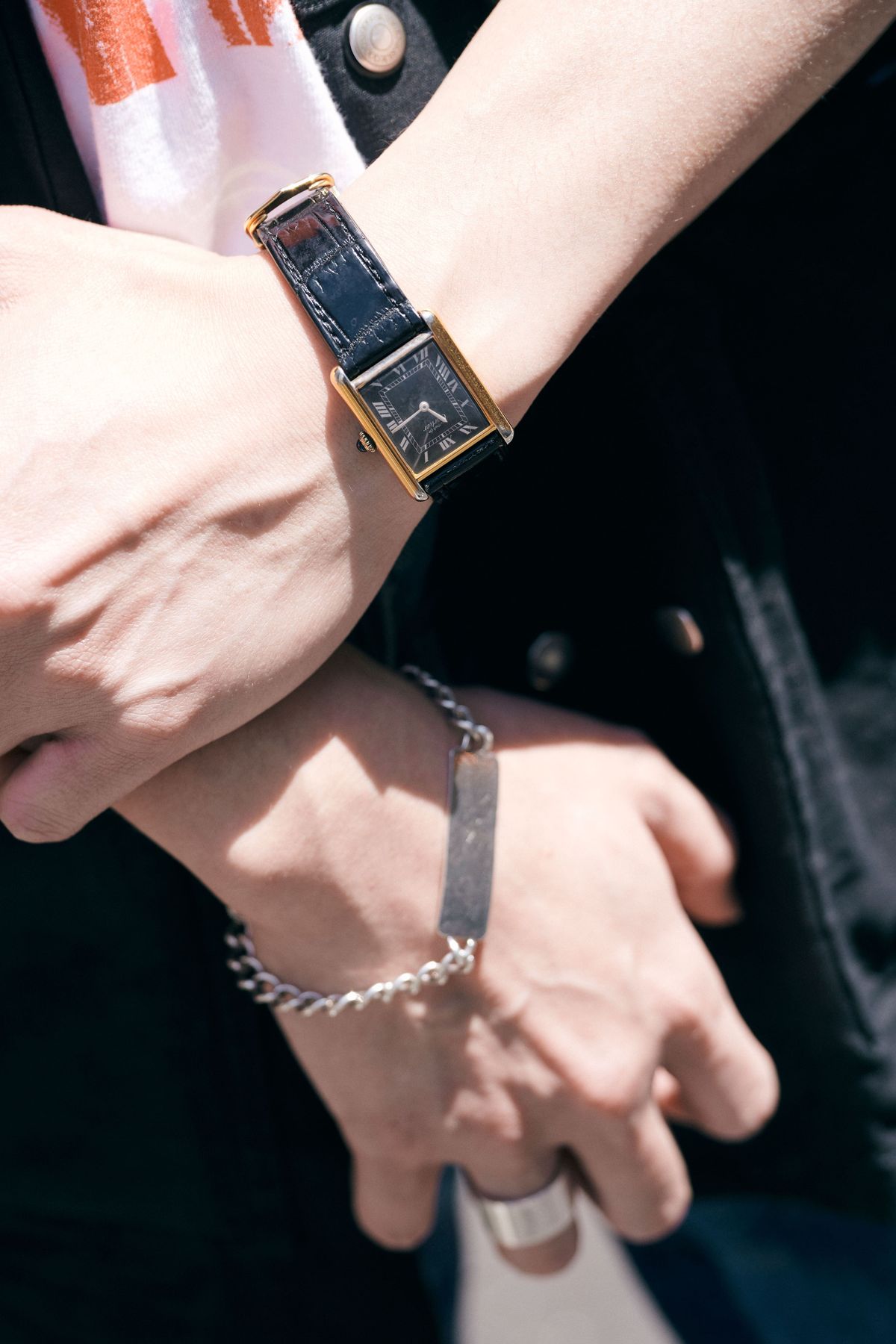 カルティエの名機「タンク」も、デニムスタイルを盛り上げる要因に。ゴールドケースとブラックダイヤルの対比が、慎ましくも鮮やかに腕元で主張する。
