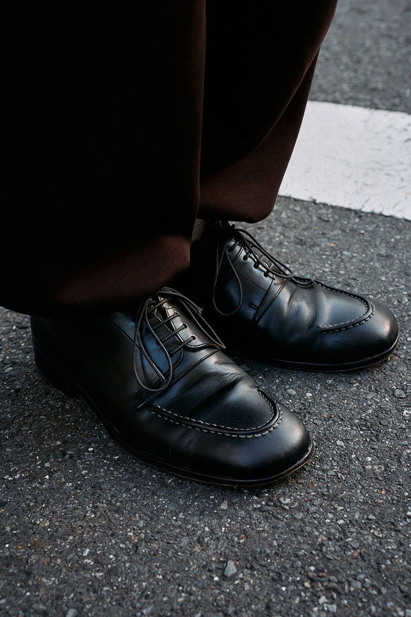 その独特な世界観をユニークなラストのレザーシューズで拾い上げ、トップスは行儀良くまとめる。しかも、シャツだってユニクロ。審美眼光りすぎ!