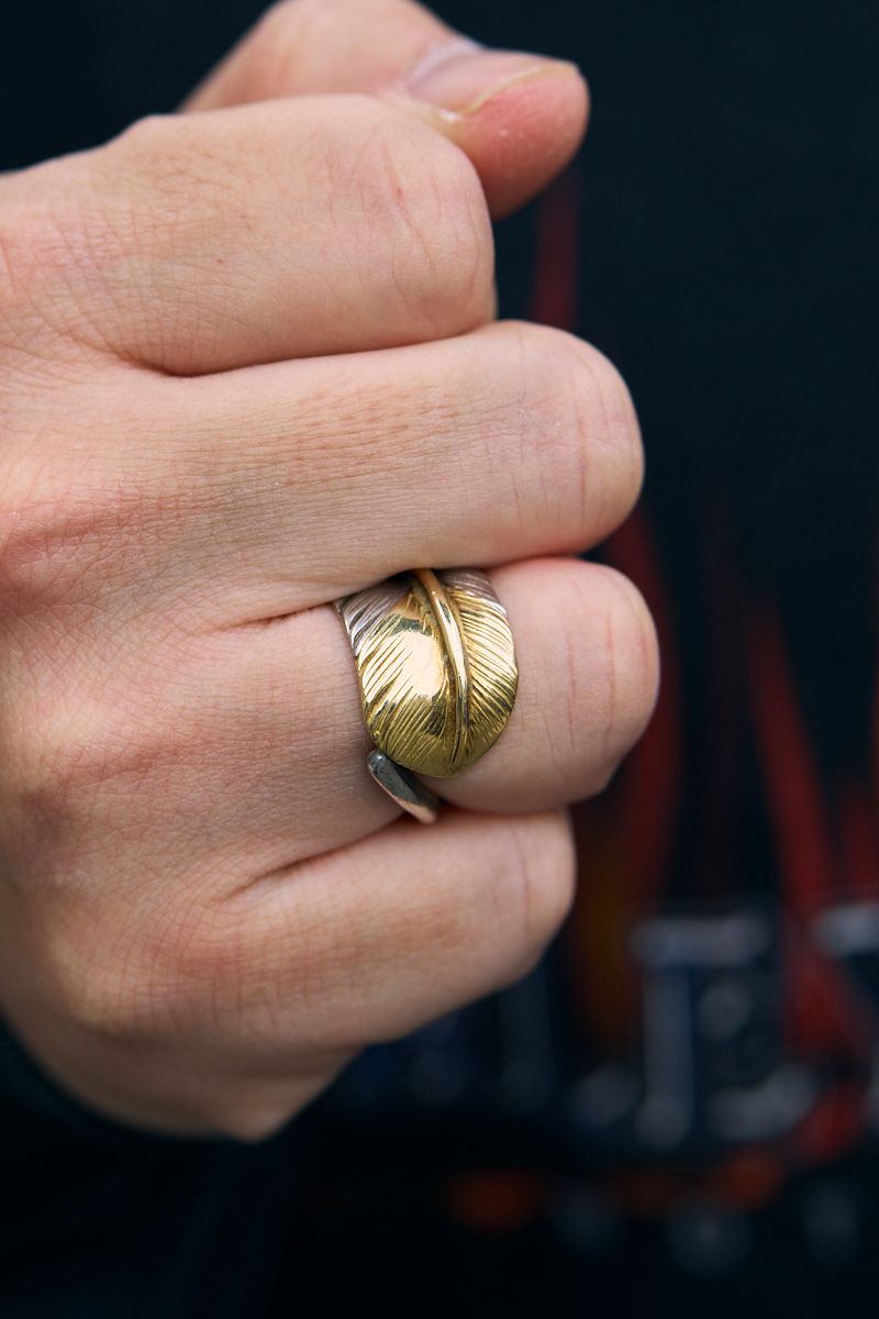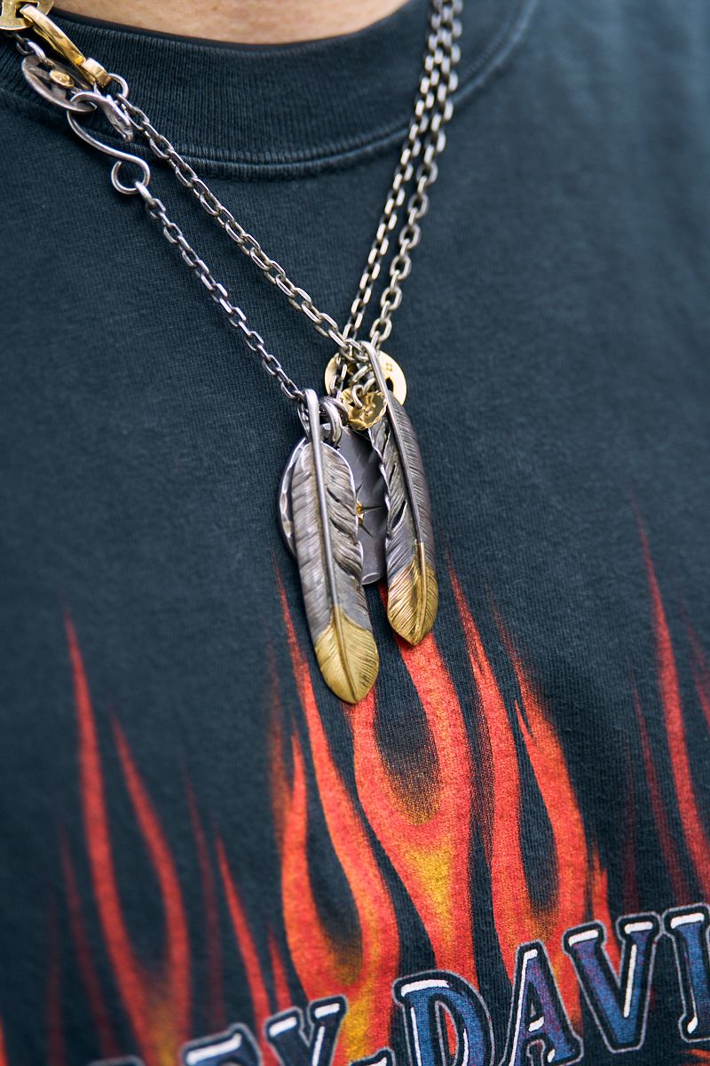 で、ゴローズのジュエリーでダメ押し。2枚のフェザーを筆頭とするスター勢揃いのネックレスに加え、フェザーとイーグルのリングを巻いて。隙なし、好きだらけ!