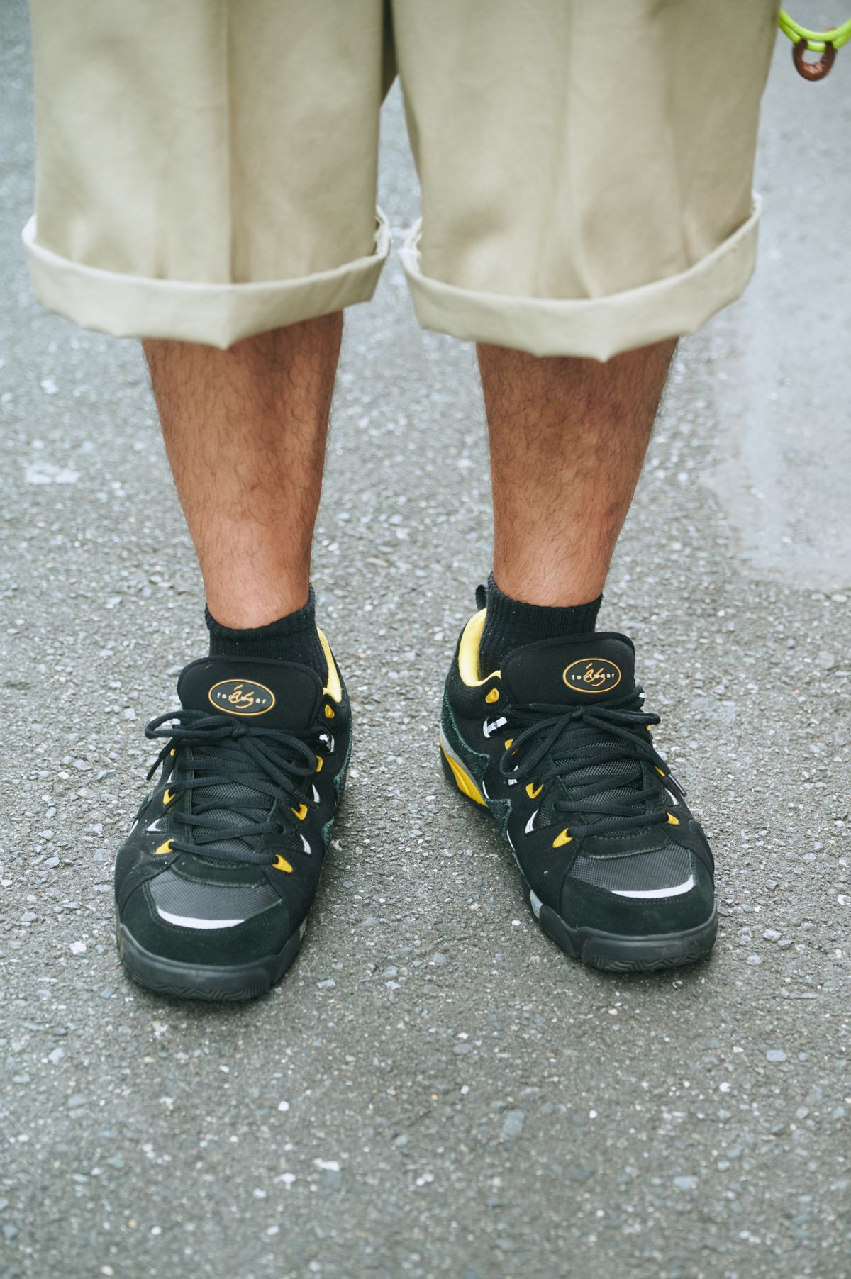 ボリューミーなシューズで、長めのショーツとバランスをとる。目深にかぶったキャップと腰から垂らしたベルトが、スタイルを感じるアクセントになる。着慣れ、こなれている。
