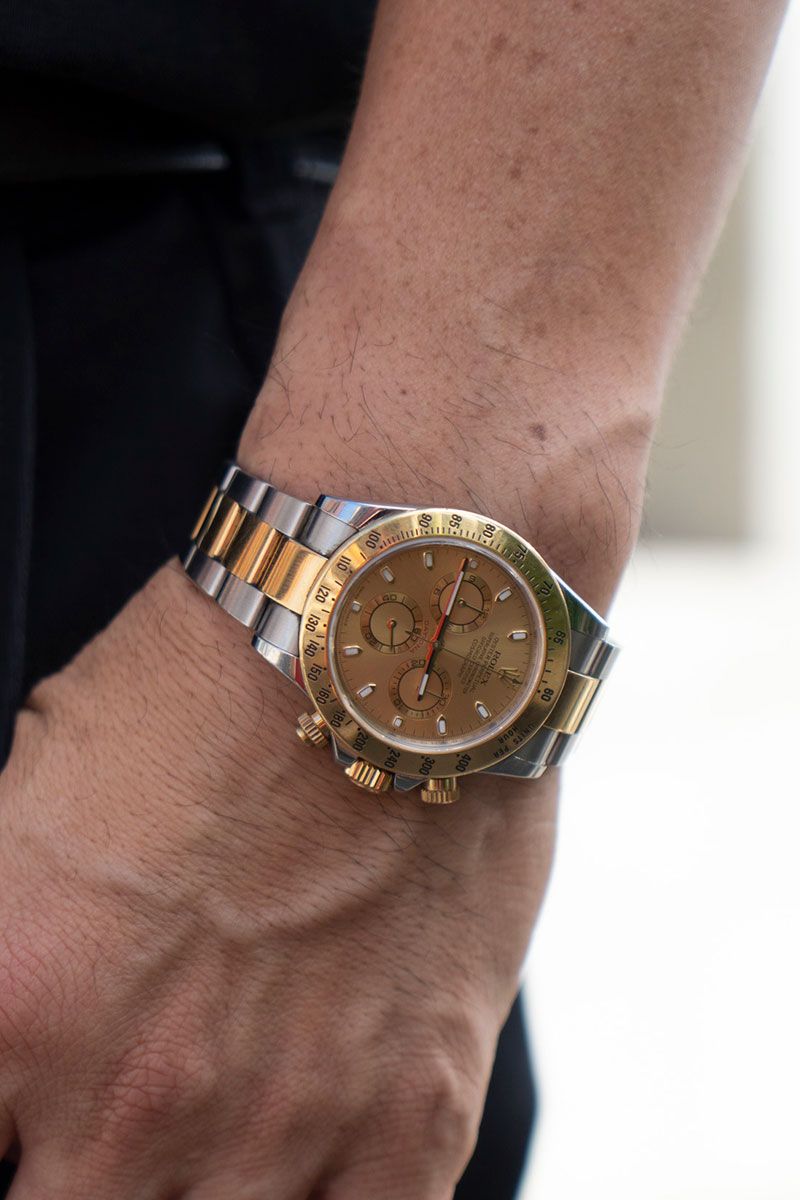 ▶︎中島さんのスナップをすべて見る中島正人さん(41歳)ロレックスの「デイトナ」。泣く子も黙りこくる超人気ブランドの大名作である。とりわけイエローゴールド×SSのコンビネーションは貫禄十二分。かの“印籠”クラスだ。