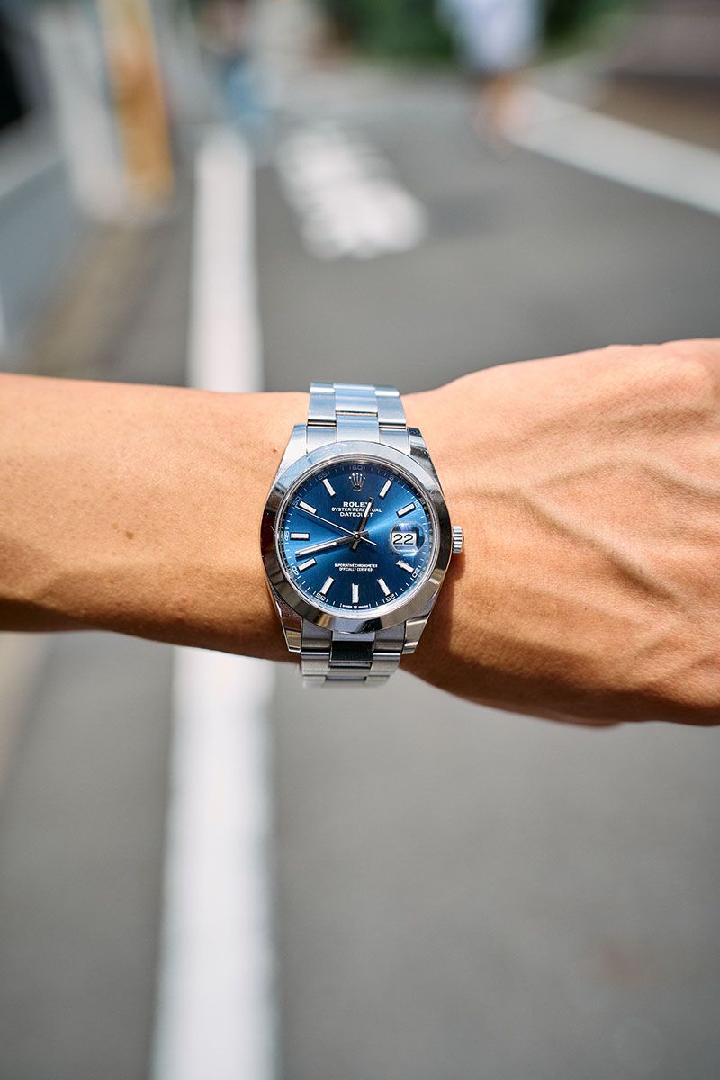 3時位置にデイト表示の小窓を備えるこちらは、定番の「デイトジャスト」。ブルー文字盤が夏の日差しを受けて上品に輝き、涼しげな腕元を演出する。