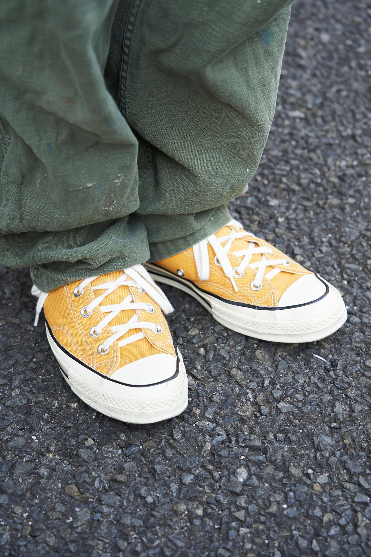 ブライトリングの腕時計でしっかり大人らしいムードを、一方で足元はペールイエローのコンバースで軽やかな雰囲気を。「大人のアメカジ、ここにアリ」といった感じだ。