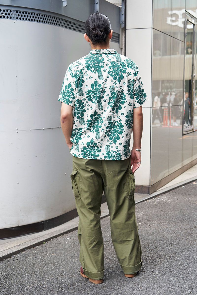 ▶︎おばたさんのスナップをすべて見るおばたさん(30歳)オーガニックコットン製の開襟シャツをキャンバスに、パームツリーがグラフィカルに踊る。ポップでクラシック。まさしく、いい大人の夏の正装に相応しい。