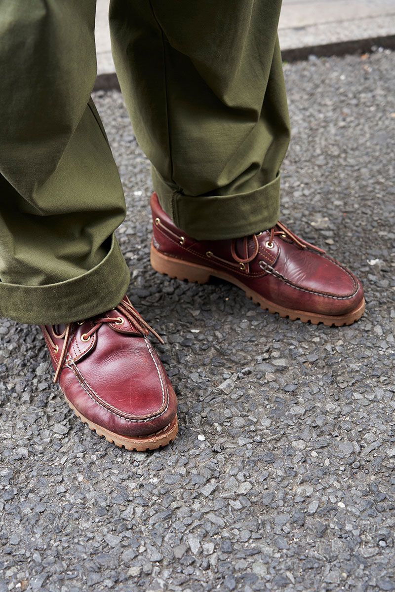 その色味を拾って、相方にはカーキカラーのカーゴパンツをチョイス。シルエットは程良くゆるく、足元はヴァーガンディの革靴で引き締めつつ。すごく上手。