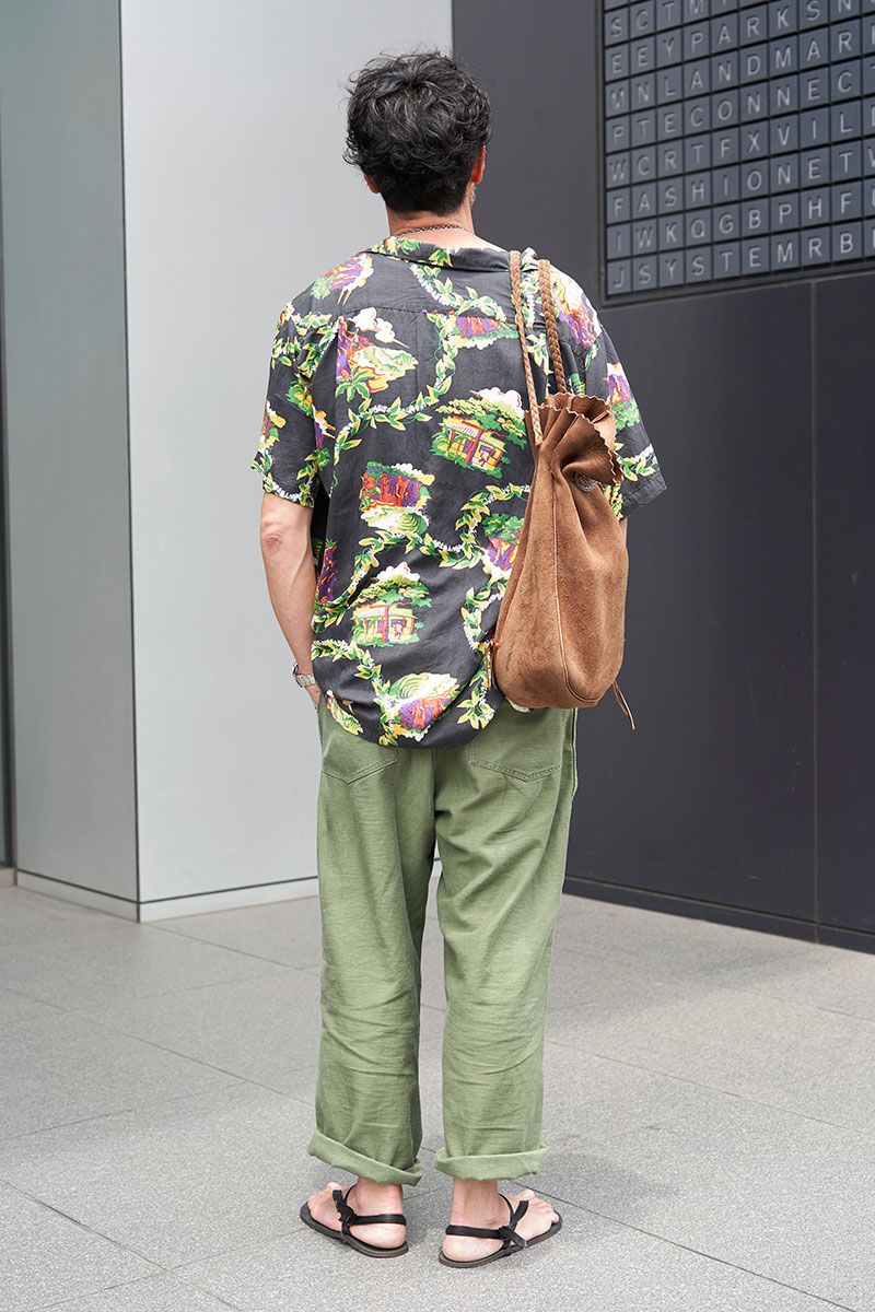 合わせは軍パン&サンダルでラフに装いつつ、アロハ同様に希少なゴローズのベルト&ジュエリーで個性的に締めくくる。時計はロレックス。総じて、数寄者の流儀を感じる。