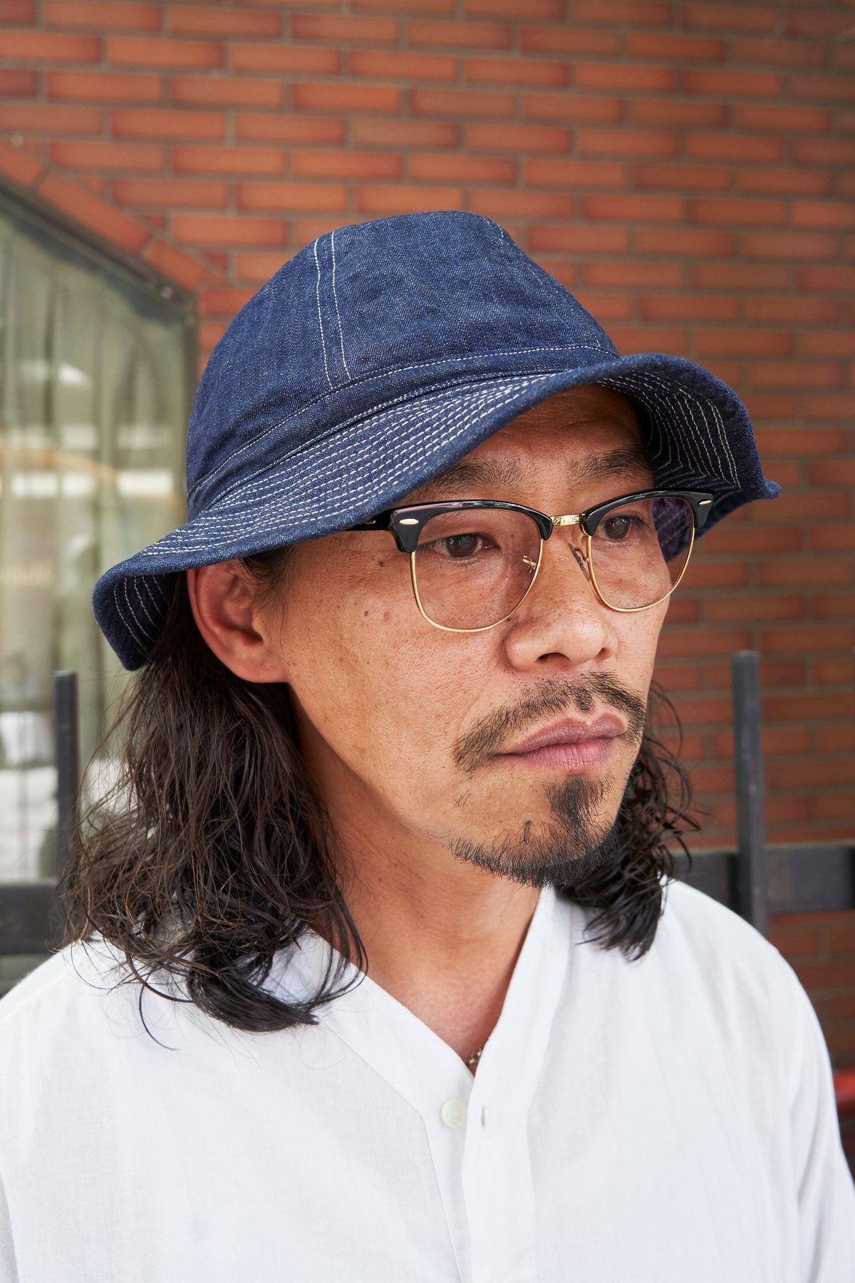▶︎山川さんのスナップをすべて見る山川真吾さん(44歳)ゴールドを効かせたハーフリムのサングラスが、クラシックなムードを演出。そこからさりげなく覗く、リラックス感あふれるロングヘアが実に好対照だ。