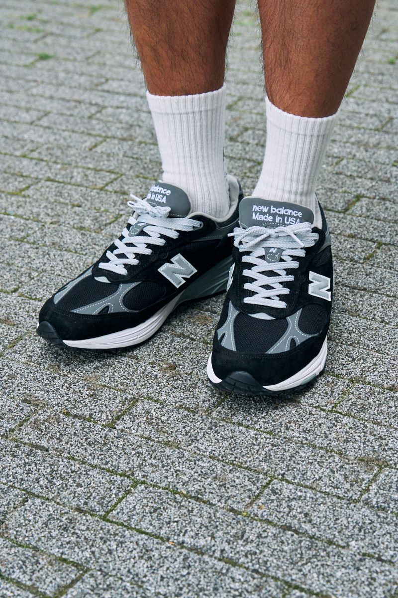 象徴的なのがグレー、黒、白という全身のカラーコードを集約したニューバランスの993。色を散らしつつも使用点数を絞ることで、唯一例外の赤いグラフィックロゴがさらなる精彩を放つ。