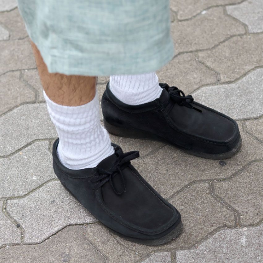 そんな短パンスタイルの足元にはクラークスのワラビーをチョイス。全体的にルーズなシルエットの着こなしを足元の黒でスッキリと締めた。