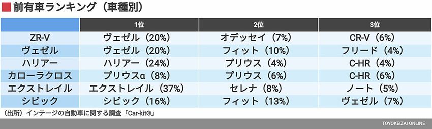 続いて購入する前に乗っていたクルマ(=前有車)を見てみよう。ZR-Vは新型車であるため、同一車種からの乗り換えはほとんど生じないタイミングである。