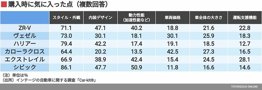先ほど価格帯で切り分けたように、カローラ クロスとも大きな差を示しつつ、ZR-Vより高価格帯のハリアー、エクストレイルをしのぐ。ただし、購入した車について、購入者がそれぞれ回答しているので、複数車種を横断して相対的に比較回答しているわけではない点には注意されたい。