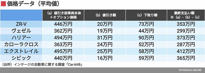 SUVではないシビックを除いた5車種について、「値引き前車両本体+オプション価格」を高い順に並べると、エクストレイル(495万円)とハリアー(494万円)がほぼ同額の約500万円、そしてZR-V(446万円)が続き、100万円ほど下がったところにカローラ クロス(363万円)、ヴェゼル(362万円)が並ぶ。