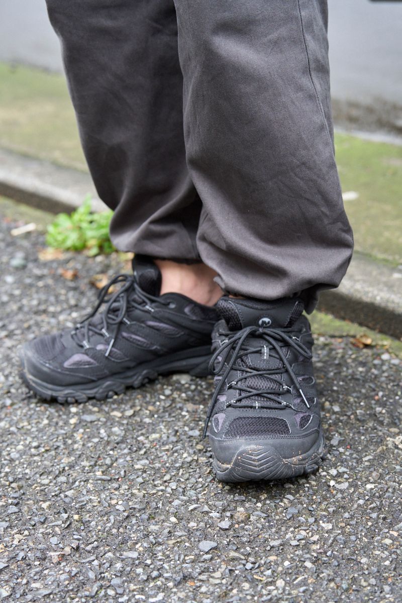 ボトムスは裾が絞れるタイプのカジュアルな1本を選び、足元にはメレルの山系スニーカーを。モノトーンでまとめながらも抑揚のある着こなしに仕上げている。