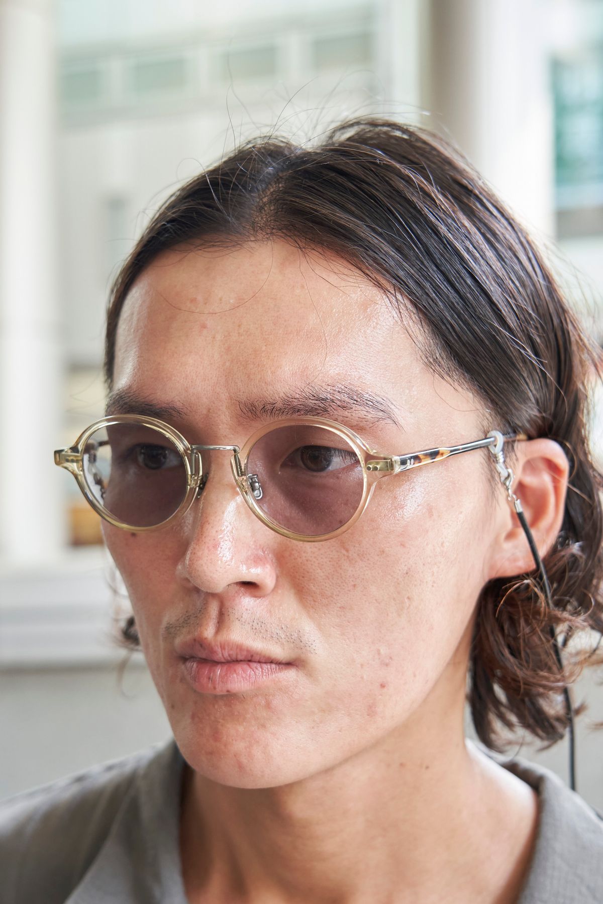 で、コンビフレームのサングラスを結びに抜擢。ライトパープルレンズとべっ甲テンプルの色気、グラスコードの安心感。いずれも、ラフな軽装に映える。