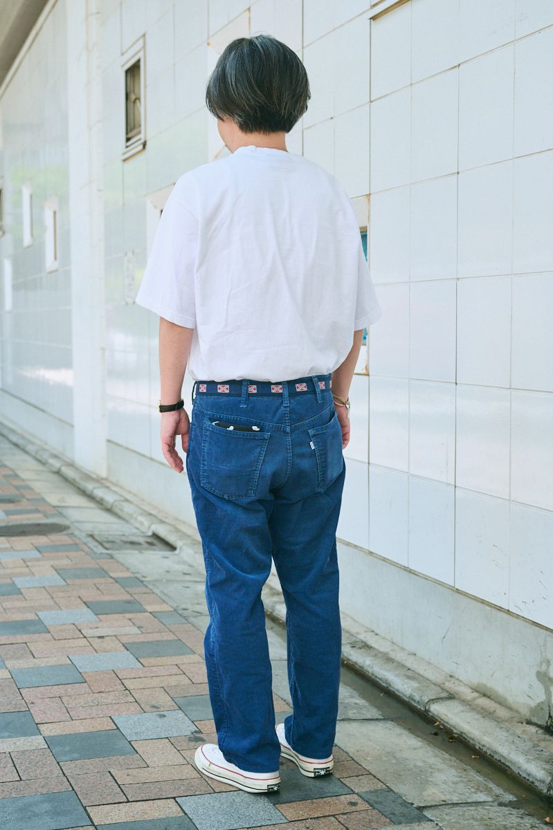 タックインについても、サイズ感こそがキモ。大きめのTシャツを選んで、腰回りに余裕が出るようにゆったりと入れる。ご覧のように、ベルトでアクセントを付けるのも有効だ。