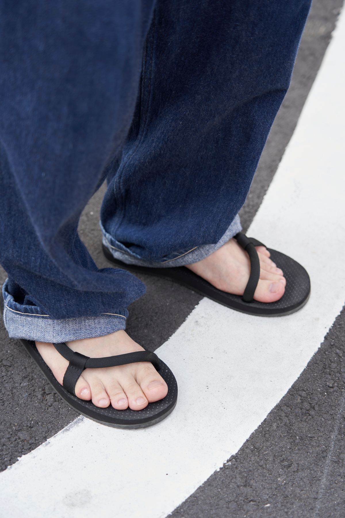 無造作にクッションしたデニム裾とサンダルの、ラフな相思相愛も注目に値。力の入れどころと抜きどころの両方を上手に作り、ストーリーのある着こなしに。