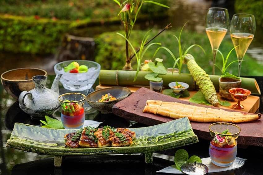 まずは朝。7月1日(火)〜8月31日(日)の期間限定で提供するのが「鰻とシャンパーニュ朝食」だ。その名のとおり、避暑地・軽井沢らしい涼やかな早朝を優雅にゆったりと堪能すべく、鰻尽くしのブレックファストとシャンパンのマリアージュを提案。