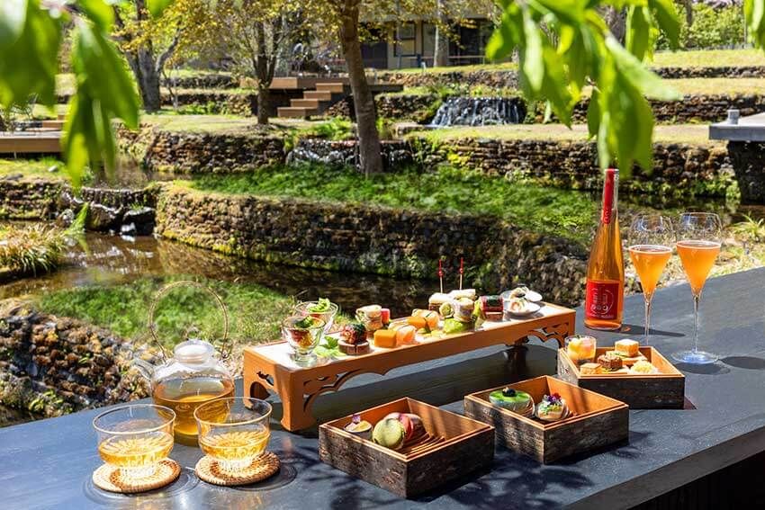 次は昼〜ティータイム。この時間帯のイチ押しは、四季折々の恵みを盛り込んだ三段重で季節感を表現する「棚田アフタヌーンティー」。アフタヌーンティー自体は昨年の棚田ラウンジのオープン時より内容を変えながら実施しており、2年めの今夏はリニューアルを遂げたサマーバージョンで登場!