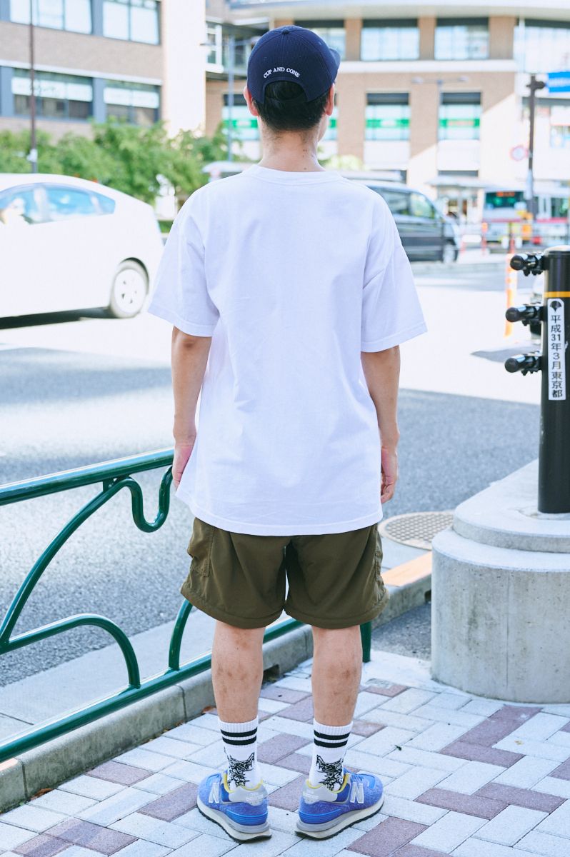 カーキのカーゴショーツやラインソックスと組み合わせることで、定番のTシャツスタイルに程よいトレンド感を加えた。
