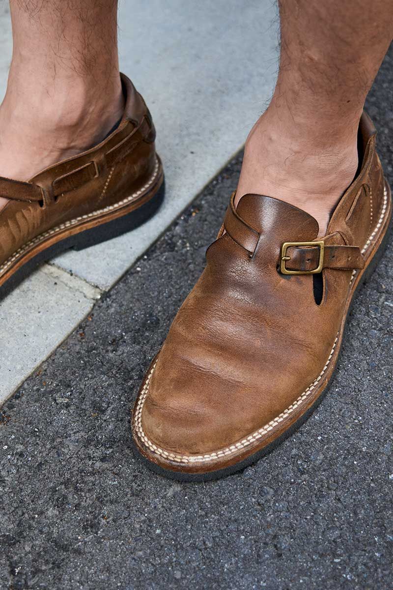 足元には味のあるブラウンのレザーシューズを選び、全体をワイルドすぎず品よくまとめている。定番アイテムを自分らしく着こなす好例だ。