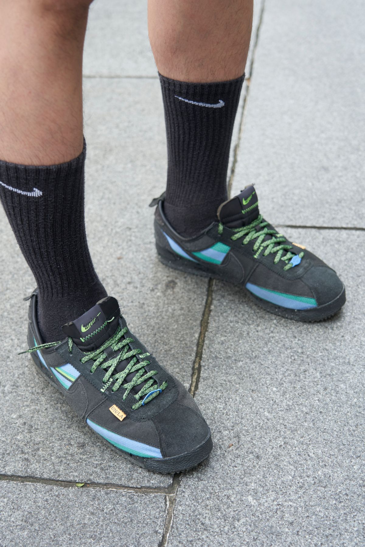シャツ=レッドキャップ ショーツ=ナイキ スニーカー=ユニオン × ナイキ キャップ=ニューエラ メガネ=モスコット バッグ、バングル=元祖仲屋むげん堂 スカーフ=ノーブランド リング=グラム 腕時計=アップル