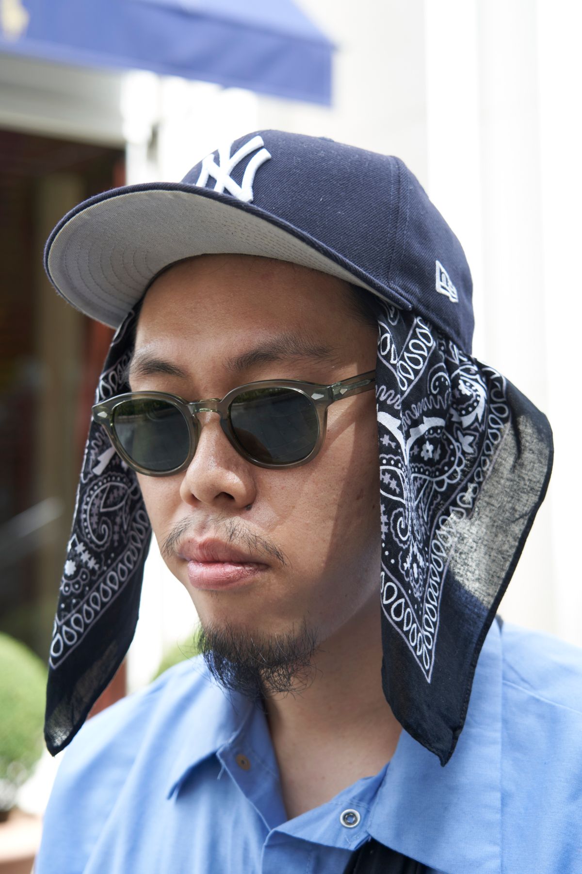 またまた涼しげなブルーシャツを発見。胸元のワッペンをよく見てみると、「UNITED Chelsea Food Services」と書かれている。編集部調べによると、ユナイテッド航空のケータリング施設。これはきっとそこの制服? おそらく古着で見つけたものなのだろう。
