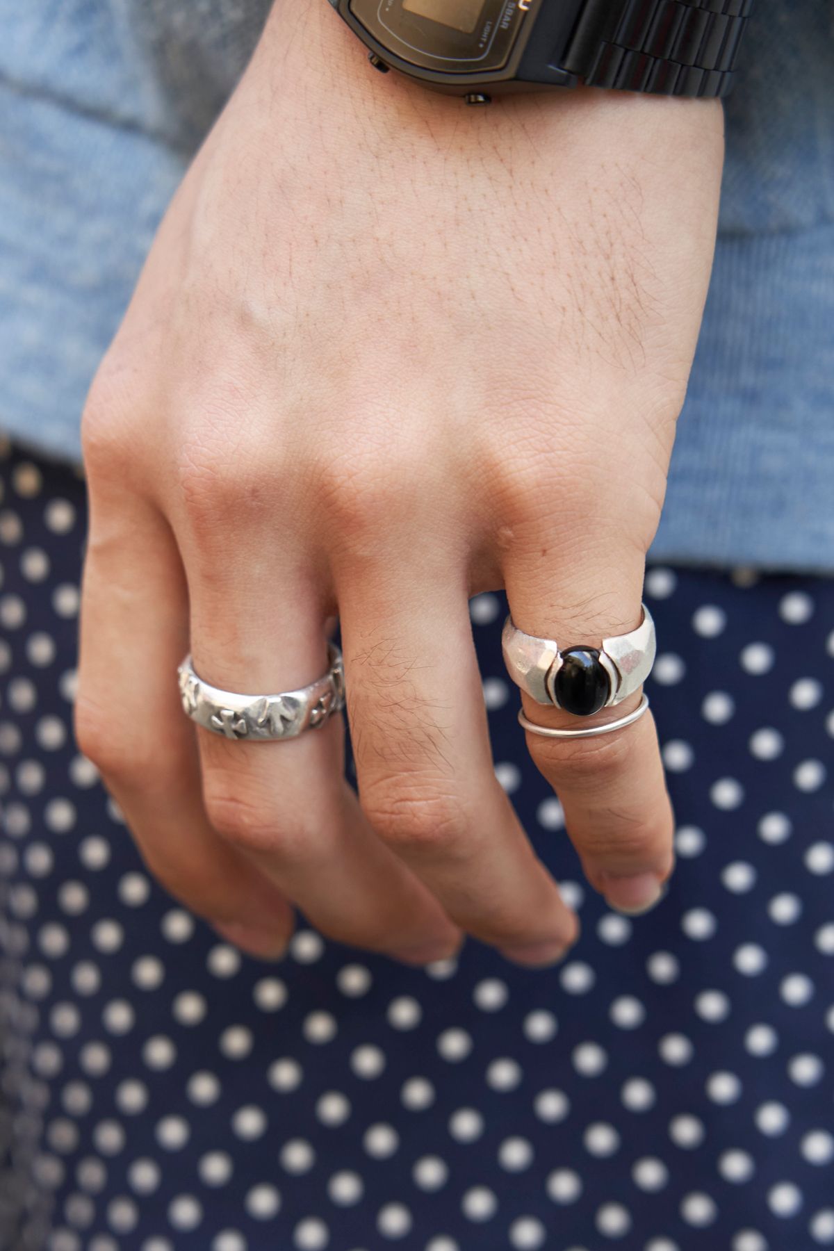 カーディガン、シャツ=ともに古着 シューズ=リーガル 眼鏡=フラミンゴ 腕時計=カシオ ネックレス、リング=ともにイチ