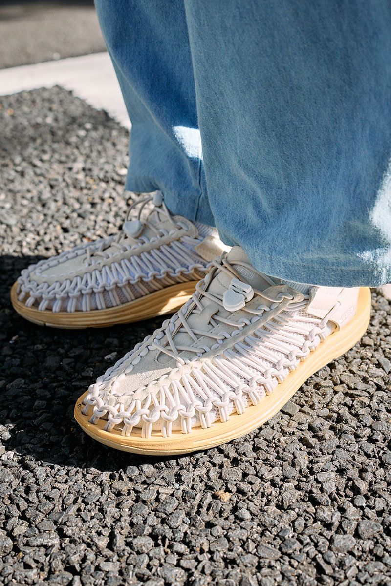高橋さんのスナップをすべて見る高橋 準さん(40歳)インディゴシャツに淡色デニムを合わせた、王道ながらも今っぽさが漂うデニム・オン・デニムスタイル。この着こなしをより爽やかに仕上げるのが、キーンの白サンダルだ。