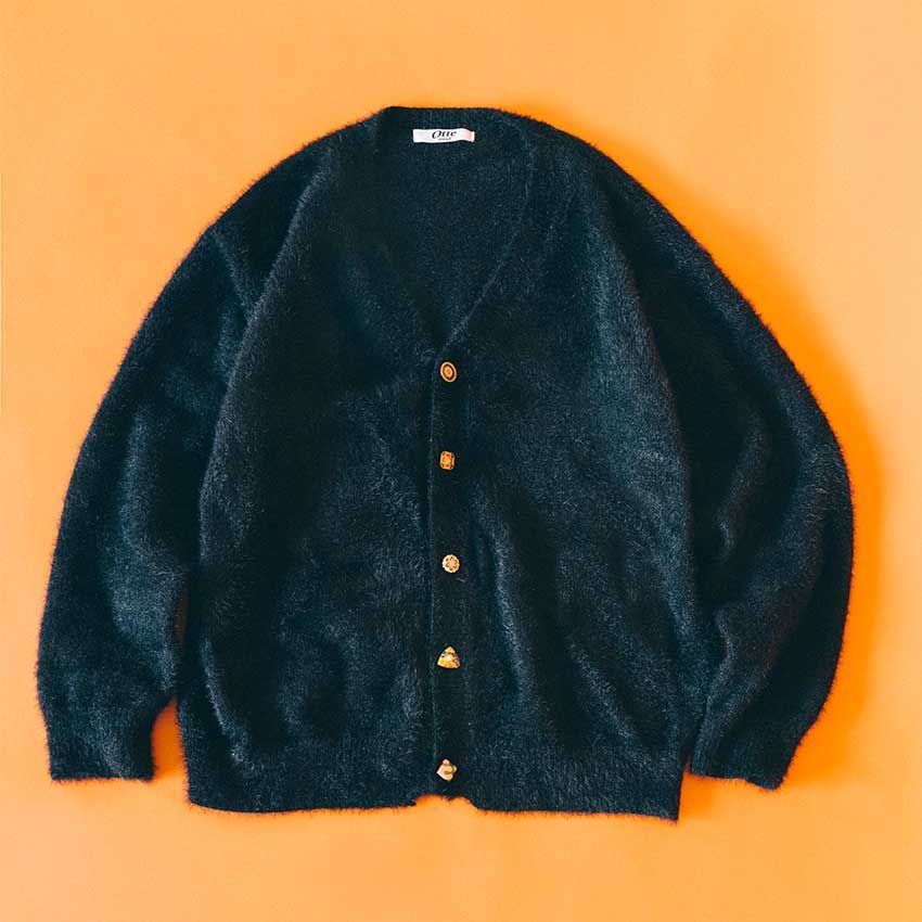 モヘヤのように⽑脚の⻑い、ブラックのナイロン×ポリウレタン仕様のカーディガン。フロントボタンにはクリアなプラスチックボタンがついていたが、久保⽥さんは全てのボタンを付け替えているのだ。