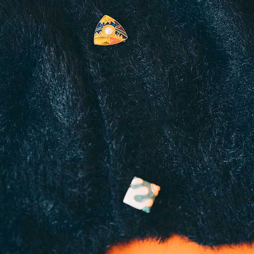 どこかネイティブ感の漂うデザインのボタンは、ひとつひとつデザインが異なる。全てネットショップで購⼊したものだ。3〜4個セットになっているものを複数購⼊し、その中から選んでつけているそう。