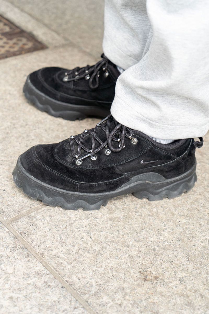 ユニクロのワイドパンツを受け止めたのはナイキ「ラハール」。武骨な一足がコーデに“重し”を与え、そのアウトドアなムードとカラーリングがサファリハットとリンクする。洗練されたアーバンアウトドアの完成!