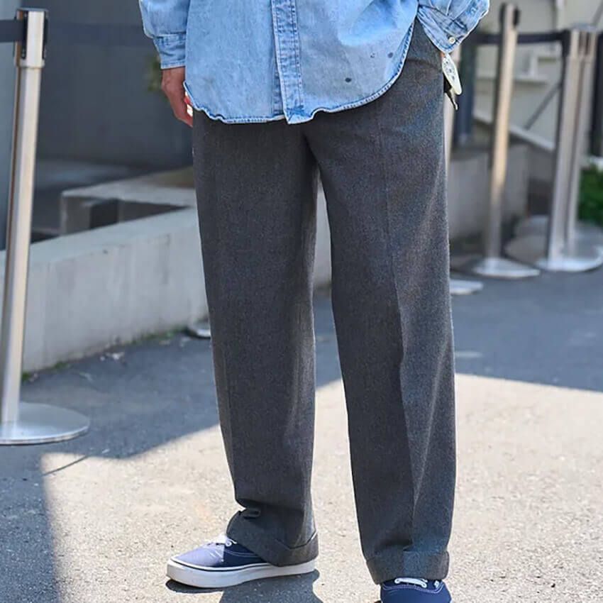 ▶︎奥村さんのスナップをすべて見る奥村崇幸さん(39歳)シンプルな長袖シャツに、同じくシンプルなワイドスラックス。無駄な飾り気がない分だけ好相性のカラーパレットが際立ち、余裕のあるシルエットも活きてくる。