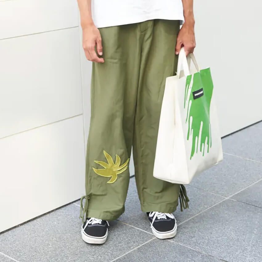 ▶︎いいじまさんのスナップをすべて見るいいじまさん(37歳)ドレープがきれいな柔らかい素材に、どこか夏らしいワッペンや裾のコードなど、デザインが利いたオリーブパンツ。主張ある一本なら、白Tだけでもこんなにサマになる。ボトムスとトートバッグの色味を合わせたのも細かなテクニック。