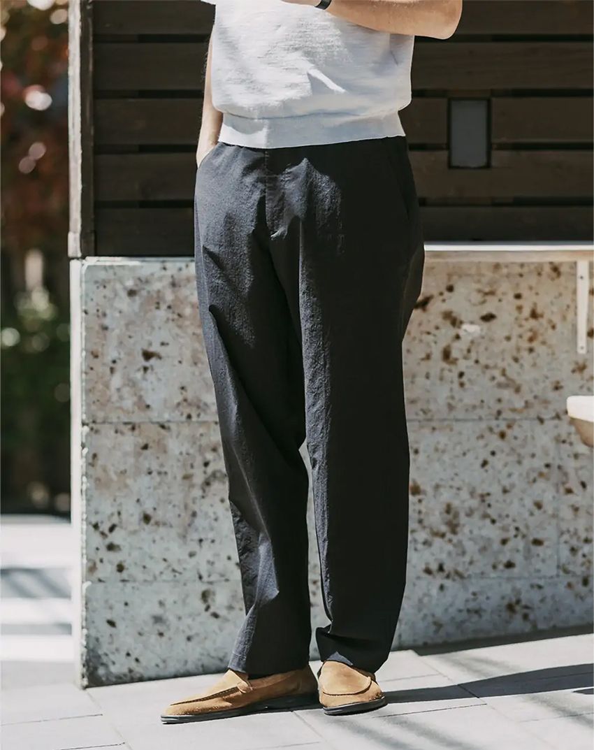 それゆえに、スエードモカシンなどのシックなシューズとも相性は抜群。リラックス感と上品さを兼ね備えたコーディネイトにひと役買う一本に。