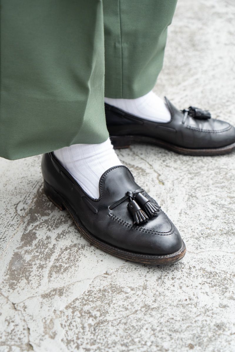 絶妙なオリーブカラーのスラックスとタッセルローファーという、シンプルだが主張のあるアイテムなら、シャツの柄も浮かない。サイズ感がユルすぎないのも、年相応に見える理由。