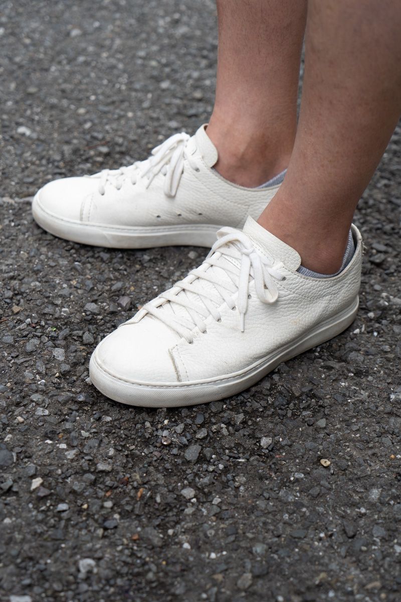 インナーの白を拾ったホワイトのレザースニーカーで、再びの涼と知性をアピール。スマートな街らしさと、奔放な海っぽさ。理想の融合を見る。