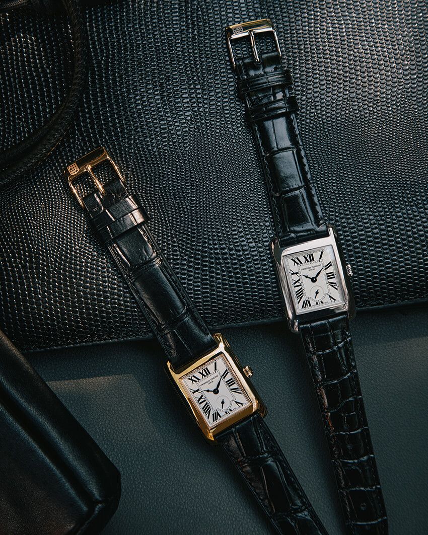 型押しレザーのモデルも展開。左は、今年登場したイエローゴールドプレートケース。右●「クラシック カレ スモールセコンド」(FC-235S2C6)、ケースサイズ縦27.6×横25.2mm 。18万1500円、左●「クラシック カレ スモールセコンド(FC-235S2C5)、ケースサイズ縦27.6×横25.2mm。19万8000円/フレデリック・コンスタント 0570-03-1988